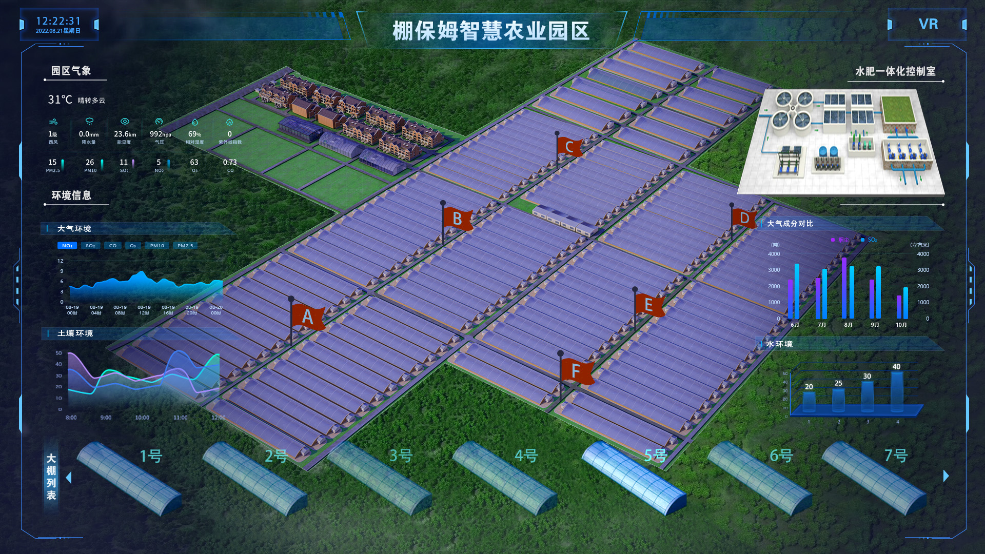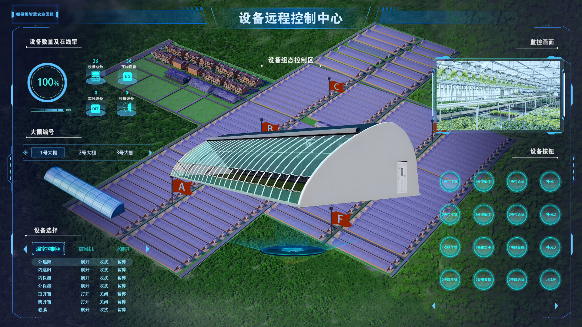 智慧農場駕駛艙基于人工智能、物聯網、大數據、云計算等前瞻科技,以物聯網作為核心技術支撐,充分應用現代信息技術成果,集成應用計算機與網絡技術、物聯網技術、音視頻技術、3S技術、無線通信技術及專家智慧與知識,配備“天地圖、虛擬園區、環境感知控制、智能水肥一體化、物資管理、農產檢測、智能大棚、植物生長模型、園區大數據平臺”等九大板塊。